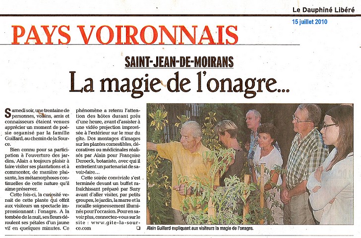 ![]() ![]() Samedi soir, une trentaine de personnes, voisins, amis et connaisseurs étaient venues apprécier un moment de poésie. Bien connu pour sa participation à l'ouverture des jardins, Alain a toujours plaisir à faire visiter ses plantations et à commenter, de manière plaisante, les métamorphoses continuelles de cette nature qu'il aime préserver. Cette fois-ci, la curiosité venait de cette plante qui offrit aux visiteurs un spectacle impressionnant: l'onagre. A la tombée de la nuit, ses fleurs déroulent ses pétales d'un jaune vif en quelques minutes. Ce phénomène a retenu l'attention des hôtes durant prés d'une heure, avant d'assister à une vidéo projection improvisée à l'extérieur sur le mur du gîte. Des montages d'images sur les plantes comestibles, décoratives ou médicinales réalisés par Alain avec Françoise Deroeck, botaniste, avec qui il entretient un partenariat de savoir-faire. Cette soirée conviviale s'est terminée devant un buffet rafraîchissant préparé par Suzy avant d'aller visiter, par petits groupes, le jardin, la mare et la rocaille soigneusement illuminés pour l'occasion. ![]() ![]() |
