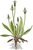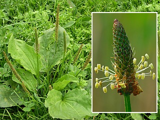 Appelée aussi : corne de cerf "Mauvaise herbe" par excellence ! Ne pas confondre avec la banane plantain ou simplement appelée plantain en Afrique Hampe florale sortant d'un bouquet de feuilles épaisses aux grosses nervures partant de la base. Le grand plantain a des feuilles larges et des fleurs allongées. Le plantain lancéolé a des feuilles allongées et des petites fleurs au bout des tiges. Le plantain moyen a des feuilles plutôt rondes et des fleurs crème à étamines violettes alors que leurs cousines sont verdâtres ou brunâtres et inodores. ![]() Tous les plantains sont comestibles. Les jeunes pousses du printemps crues en salades composées. E lles peuvent être cuites, selon les mêmes apprêts que l'épinard. Excellentes pour parfumer les omelettes. Les feuilles hachées finement se consomment en salade et comme légume vert. Les jeunes sommités fleuries crues peuvent être ajoutées aux salades cuites à la vapeur, ou frites. ![]() - une salade romaine, une poignée de jeunes feuilles de plantain, - une douzaine de filets d'anchois - huile d'olive, 1 gousse d'ail, vinaigre, sel, poivre, croûtons de pain . • laver et préparer les salades : • couper en gros morceaux la romaine et le plantain • préparer la vinaigrette. • couper les anchois en petits morceaux. • mélanger romaine, plantain, anchois et vinaigrette. • servir avec des croûtons frottés à l'ail . ![]() • passer à la moulinette 4 poignées de feuilles • ajouter de l'eau, 300g de sucre et 250 g de miel. • laisse mijoter à feux doux, en tournant constamment, jusqu'à formation d'un liquide épais.